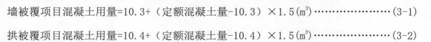 1.岩层工程混凝土、钢筋混凝土被覆,施工允许超挖定额按平均75mm以块石混凝土充填编制,其中充填块石占三分之一,三分之二为被覆同等级混凝土。如设计要求全部用同等级混凝土充填时,可扣除定额充填块石费用,定额混凝土用量按下式调整: