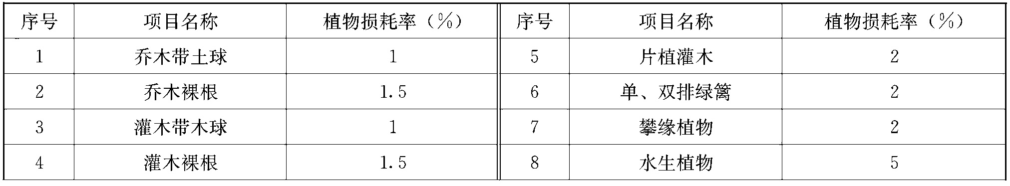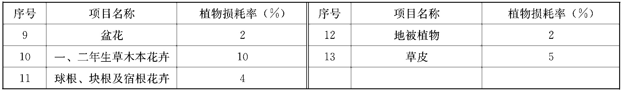 十五、绿化工程植物成活率按《园林绿化工程施工及验收规范》CJJ/T82—2012规定执行,乔灌木成活率及草坪覆盖率应不低于95%。定额苗木损耗率详见表1。