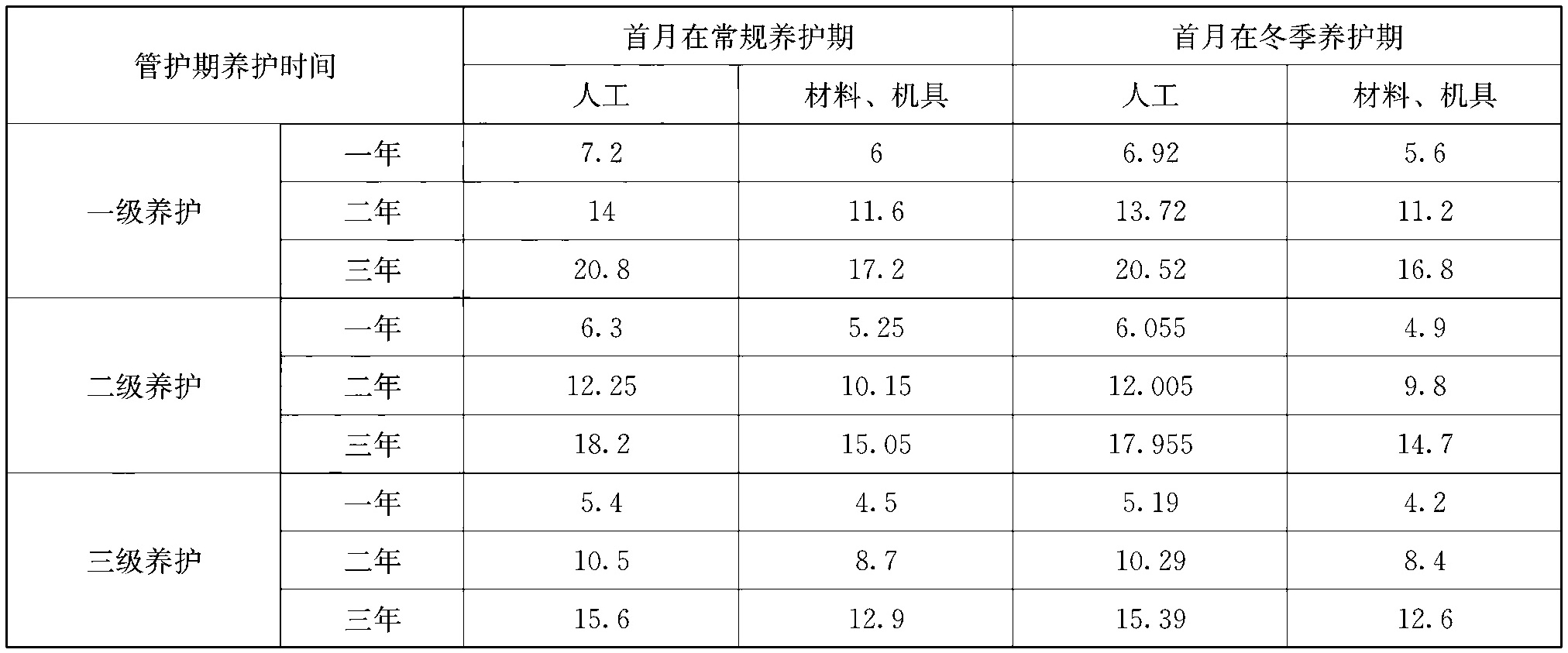 二十、园林绿化养护管理按《园林绿化养护标准》CJJ/T287—2018规定执行,施工期养护包括常规养护期(4月1日至10月31日)和冬季养护期(11月1日至3月31日)。常规养护期按月计算,首月定额乘以系数1.5;冬季养护期按常规养护期定额人工乘以系数0.3,不计材料费、机械费。管护期养护分为三级,一级养护管理按施工期养护乘以系数0.8,二级养护管理按施工期养护乘以系数0.7,三级养护管理按施工期养护乘以系数0.6。管护期养护常用系数见表2。