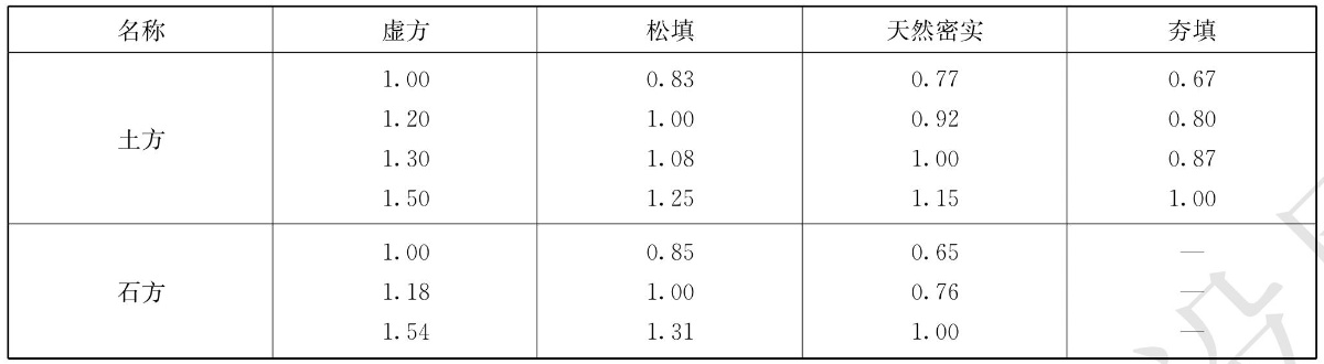 四、回填夯实定额中的填土夯实与碾压及回填夯实,均按设计图示回填体积以“100m3”计算;原土夯实与碾压则按设计图示尺寸以“100m2”计算。土石方体积换算见下表。