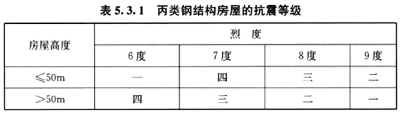 5.3.1 钢结构房屋应根据设防类别、设防烈度和房屋高度采用不同的抗震等级,并应符合相应的内力调整和抗震构造要求。抗震等級确定应符合下列规定: