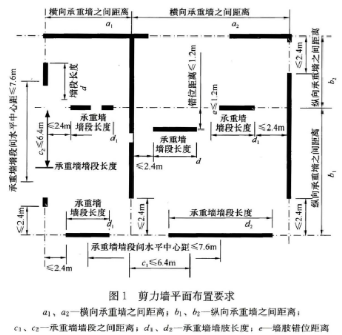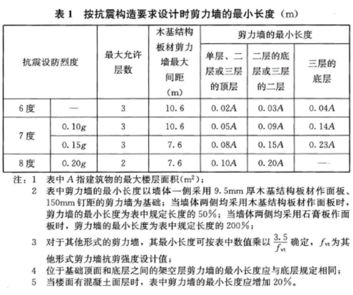 2 当抗侧力设计按构造要求进行设计时,在不同抗震设防烈度的条件下,剪力墙最小长度应符合表1的规定;在不同风荷载作用时,剪力墙最小长度应符合表2的规定。