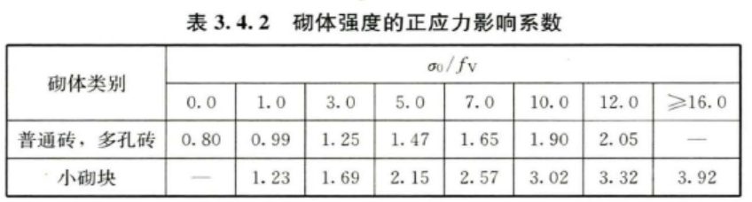 ζN——砌体抗震抗剪强度的正应力影响系数,应根据对应于重力荷载代表值的砌体截面平均压应力σ0与非抗震设计的砌体抗剪强度设计值fV的比值按表3.4.2采用。