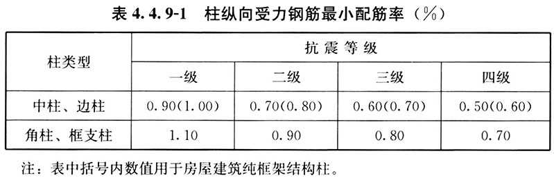 1 柱全部纵向普通钢筋的配筋率不应小于表4. 4. 9-1的规定,且柱截面每一侧纵向普通钢筋配筋率不应小于0.20%;当柱的混凝土强度等级为C60以上时,应按表中规定值增加0.10%采用;当采用400MPa级纵向受力钢筋时,应按表中规定值增加0.05%采用。