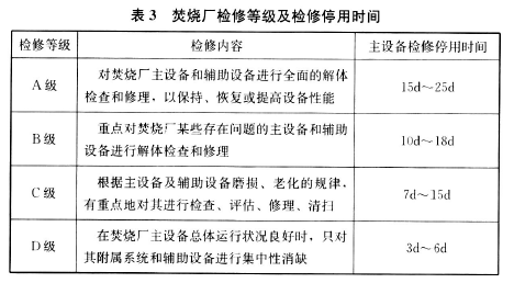 3.4.3 生活垃圾成分复杂,焚烧时烟气中含有大量腐蚀性气体,对余热锅炉水冷壁、过热器等受热面造成严重腐蚀和冲刷;为防止焚烧厂频繁发生余热锅炉受热面泄漏,影响焚烧线的安全、稳定运行和环保达标排放,焚烧厂检修时应认真开展受热面管子的监督工作,对存在问题的受热面管子及时处理,保证垃圾焚烧炉及余热锅炉安全运行,为此规范编制组参考《火力发电厂金属技术监督规程》DL/T 438-2016及《火力发电厂锅炉受热面管监督技术导则》DL/T 939-2016相关条款,对焚烧厂分级检修时的相关金属监督项目、内容和检修要求进行了规定。本条中测厚抽检率不低于20%是参考《火力发电厂金属技术监督规程》DL/T 438-2016第7.2.1.1条的规定制定的:"7.2.1.1机组第一次A级检修或B级检修,应查阅管件及阀门的质保书、安装前检验记录,根据安装前对管件、阀壳的检验结果,重点检查缺陷相对严重、受力较大部位以及壁厚较薄的部位。检查项目包括外观、光谱、硬度、壁厚、椭圆度检验和无损探伤。若发现硬度异常,宜进行金相组织检查。对安装前检验正常的管件、阀壳,根据设备的运行工况,按大于等于管件、阀壳数量的10%进行以上项目检查,后次A级检修或B级检修的抽查部件为前次未检部件”,考虑到生活垃圾焚烧烟气成分复杂并含有大量酸性气体,对余热锅炉受热面会产生严重腐蚀,需要在检修中重点检查和测量,将抽检率提高至20%,焚烧厂检修分级应按检修规模和停用时间分为A.B、C、D四级,检修等级的划分及检修停用时间宜符合表3的规定。