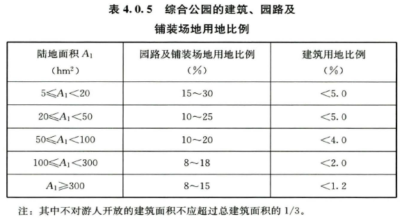 4.0.5 综合公园的建筑、园路及铺装场地用地比例应符合表4.0.5的规定。