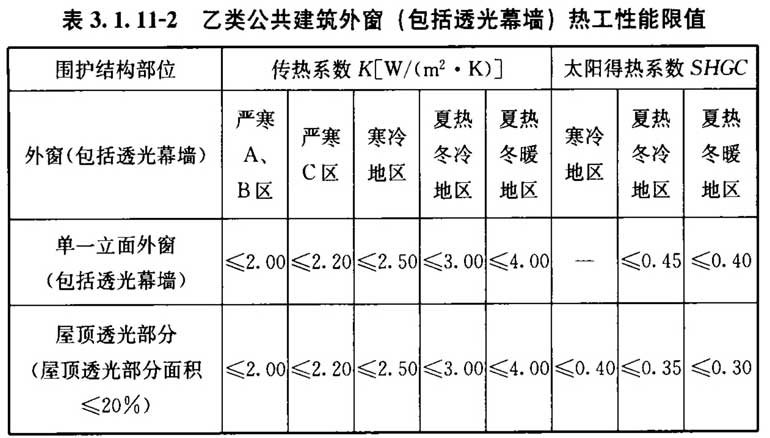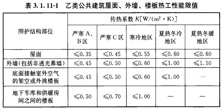 3. 1. 11 乙类公共建筑的围护结构热工性能应符合表3. 1. 11-1和表3. 1. 11-2的规定。