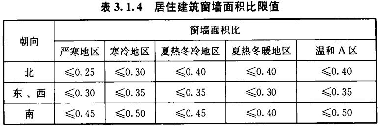 3. 1. 4 居住建筑的窗墙面积比应符合表3. 1. 4的规定;其中,每套住宅应允许一个房间在一个朝向上的窗墙面积比不大于0.6。