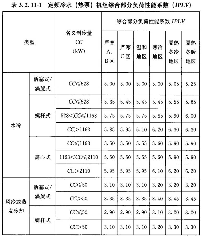 2 定频水冷机组及风冷或蒸发冷却机组的综合部分负荷性能系数(IPLV)不应低于表3. 2. 11-1的数值;