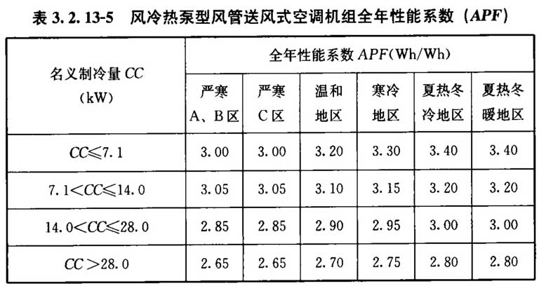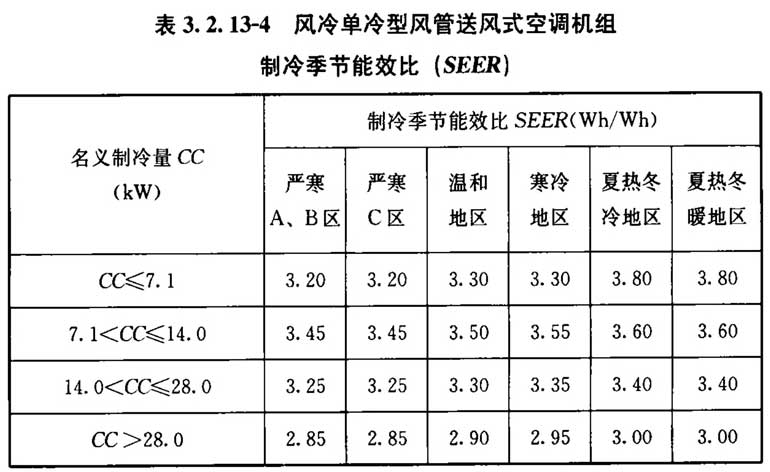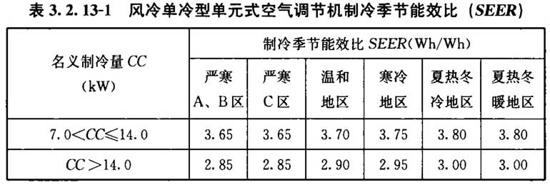 3. 2. 13 采用电机驱动的单元式空气调节机、风管送风式空调(热泵)机组时,其在名义制冷工况和规定条件下的能效应符合下列规定: