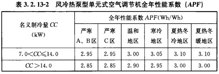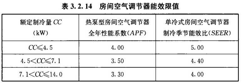 3. 2. 14 除严寒地区外,采用房间空气调节器的全年性能系数(APF)和制冷季节能效比(SEER)不应小于3. 2. 14的规定。