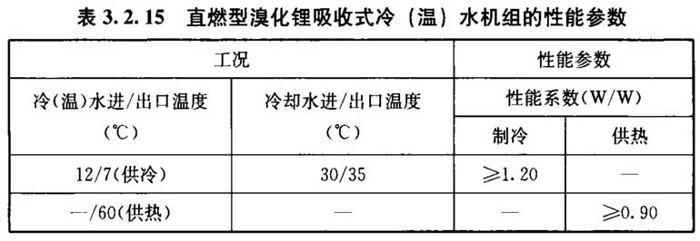 3. 2. 15 采用直燃型溴化锂吸收式冷(温)水机组时,其在名义工况和规定条件下的性能参数应符合表3. 2. 15的规定。