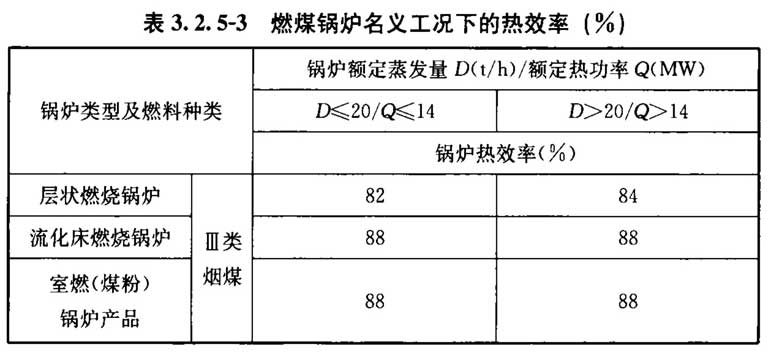 3. 2. 5 锅炉的选型,应与当地长期供应的燃料种类相适应。在名义工况和规定条件下,锅炉的设计热效率不应低于表3. 2. 5-1~表3. 2. 5-3的数值。