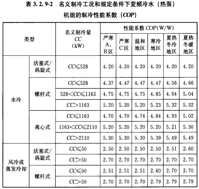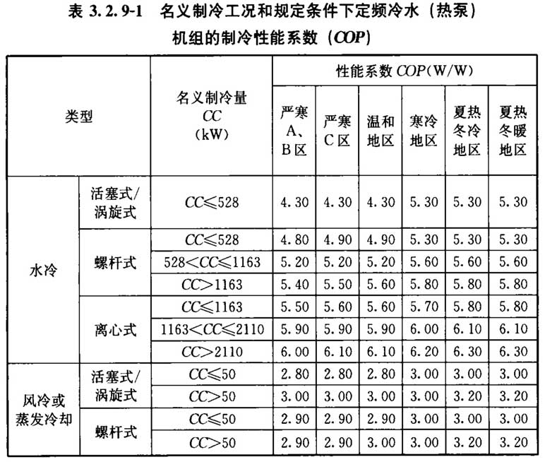 3. 2. 9 采用电机驱动的蒸汽压缩循环冷水(热泵)机组时,其在名义制冷工况和规定条件下的性能系数(COP)应符合下列规定: