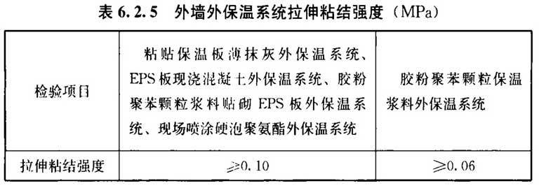 6. 2. 5 外墙外保温系统经耐候性试验后,不得出现空鼓、剥落或脱落、开裂等破坏,不得产生裂缝出现渗水;外墙外保温系统拉伸粘结强度应符合表6. 2. 5的规定,并且破坏部位应位于保温层内。