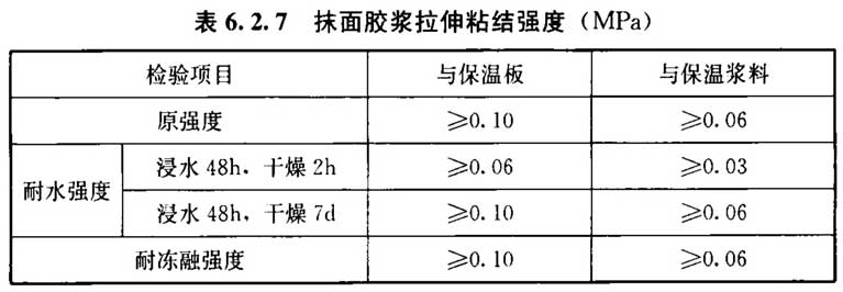 6. 2. 7 抹面胶浆拉伸粘结强度应符合表6.2.7的规定,抹面胶浆与保温材料的粘结在原强度、浸水48h后干燥7d的耐水强度条件下发生破坏时,破坏部位应位于保温材料内。