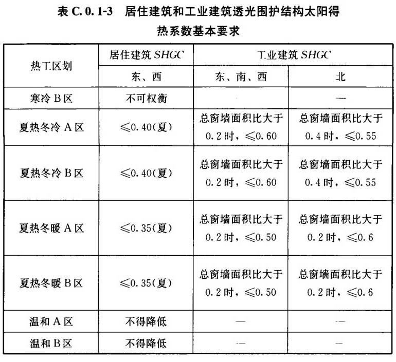 2)居住建筑和工业建筑透光围护结构太阳得热系数的基本要求应符合表C.0.1-3的规定。