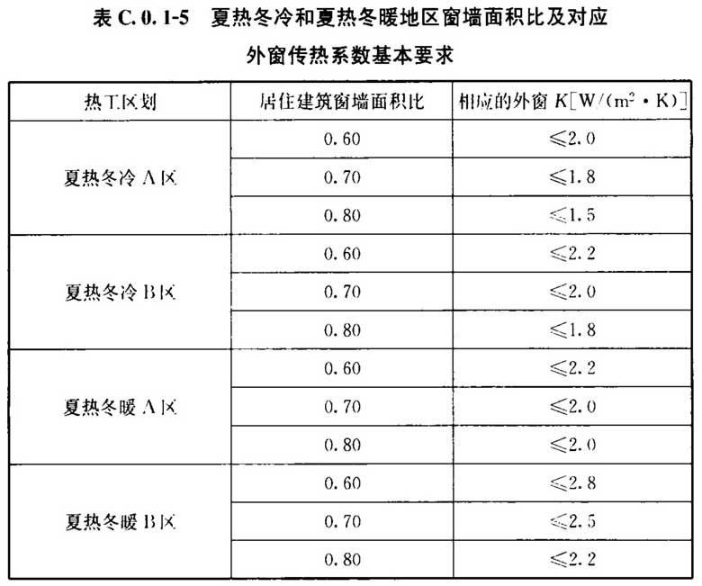 2)夏热冬冷、夏热冬暖地区居住建筑窗墙面积比大于或等于0.6时,其外窗传热系数的基本要求应符合表C.0.1-5的规定。