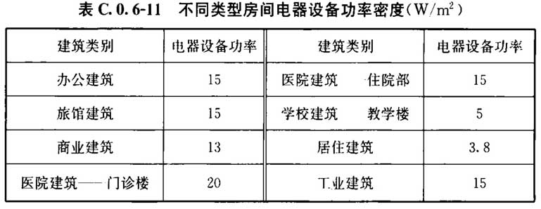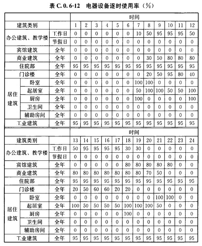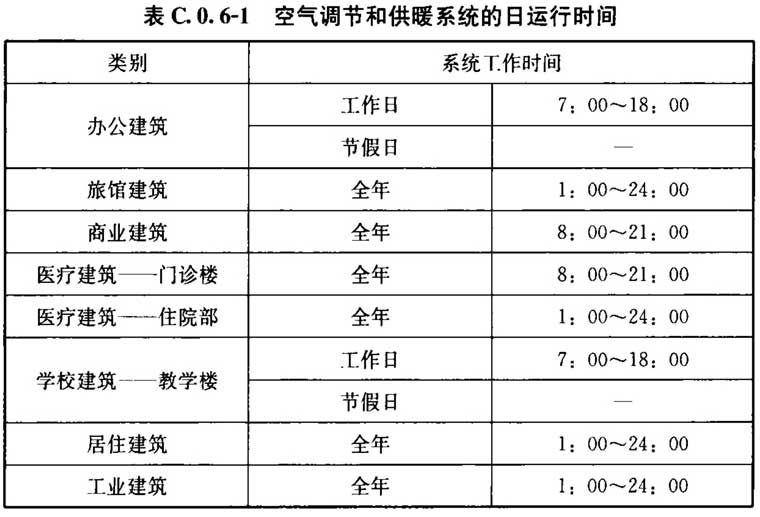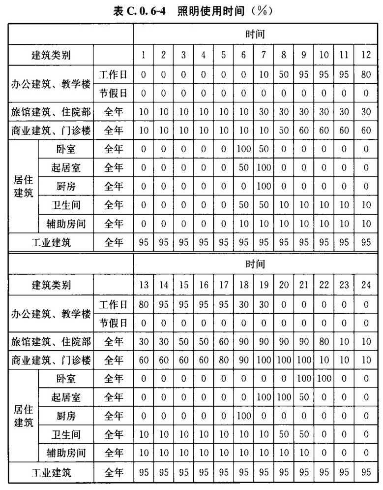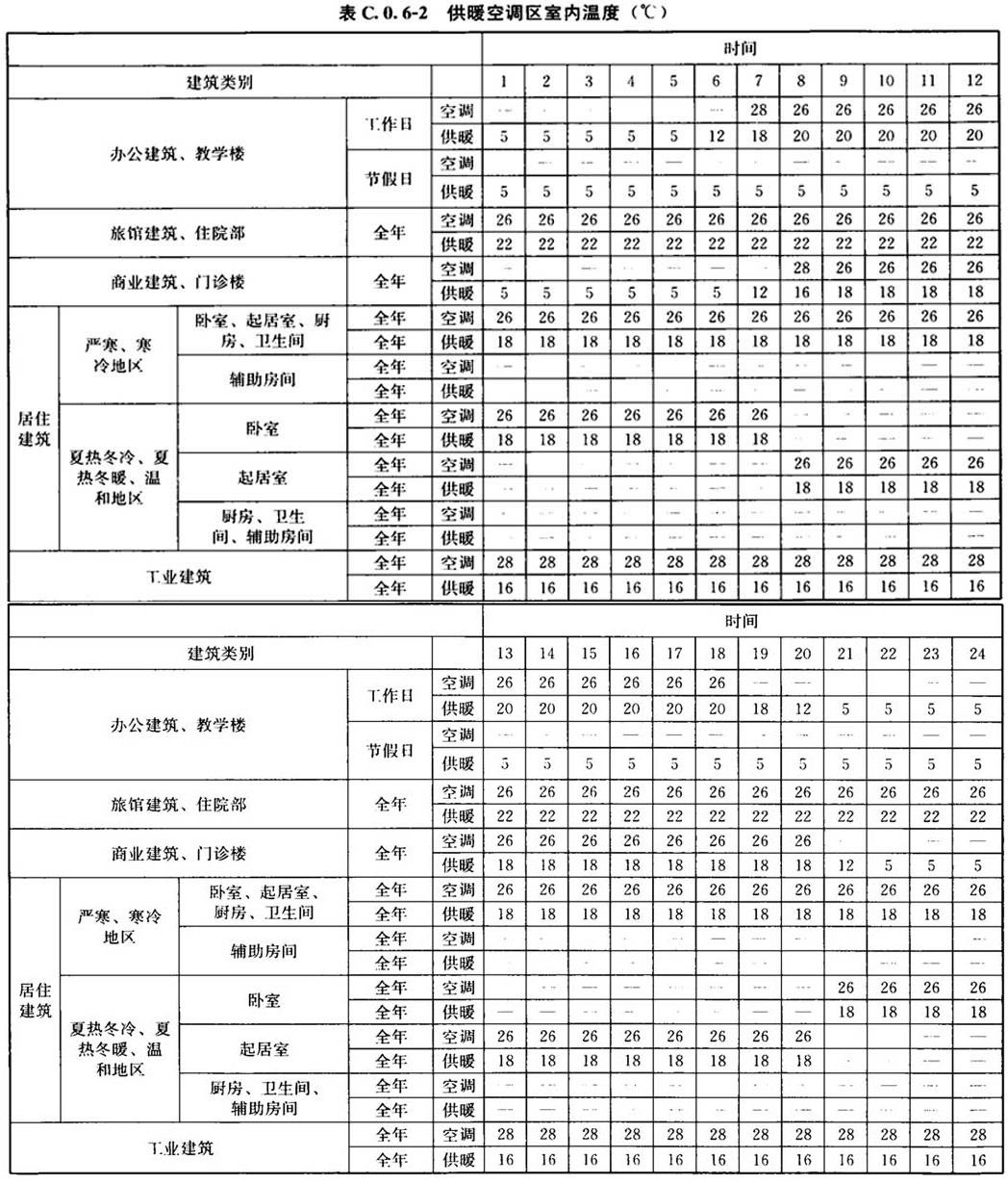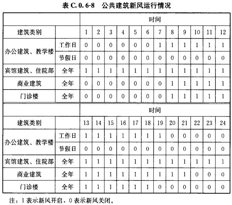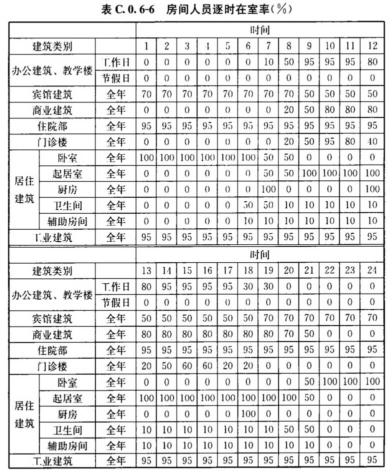 C. 0. 6 建筑的空气调节和供暖系统运行时间、室内温度、照明功率密度值及开关时间、房间人均占有的建筑面积及在室率、人员新风量及新风机组运行时间表、电器设备功率密度及使用率应符合表C.0.6-1~表C.0.6-13的规定。