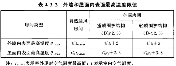 4.3.2 在给定两侧空气温度及变化规律的情况下,外墙和屋面内表面最高温度应符合表4.3.2的规定。