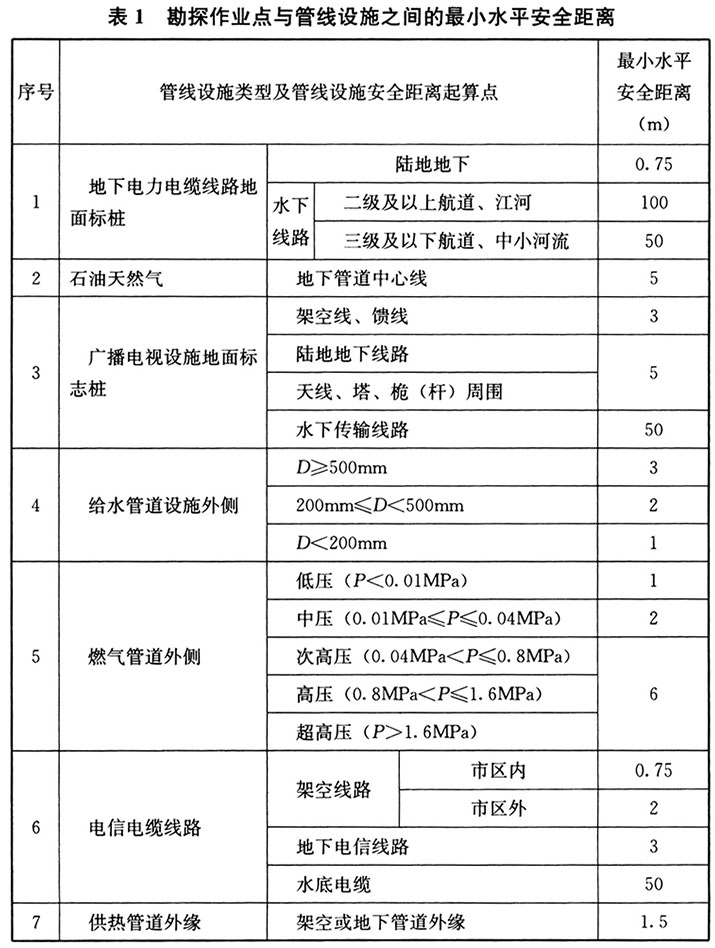 除了电力之外,不同部门也制定了勘探作业点与管线设施之间的最小水平安全距离,见表1。