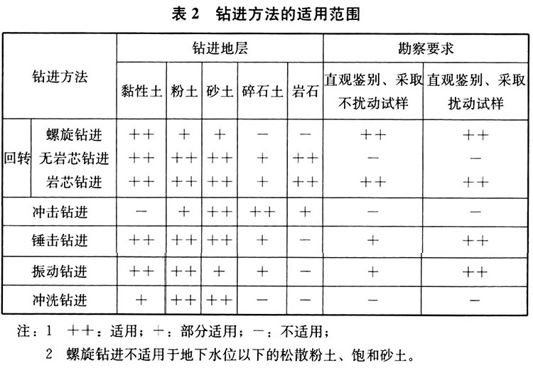 4. 3. 1 为了达到勘察目的,要选择合适的钻探设备和钻进方法。钻进方法的适用范围见表2。