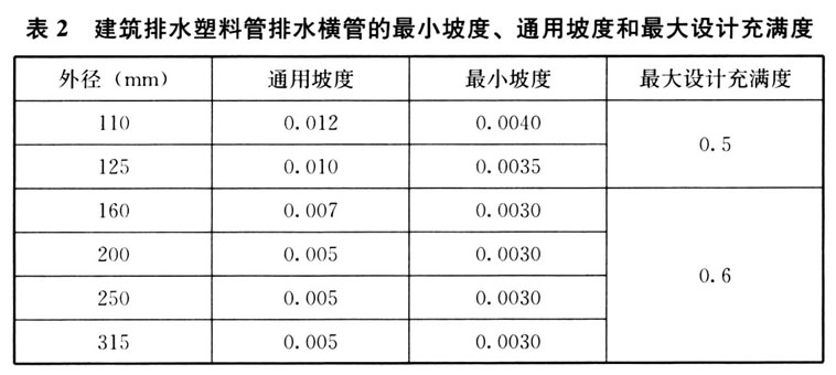 (2)建筑排水塑料管排水横管的最小坡度、通用坡度和最大设计充满度,见表2。