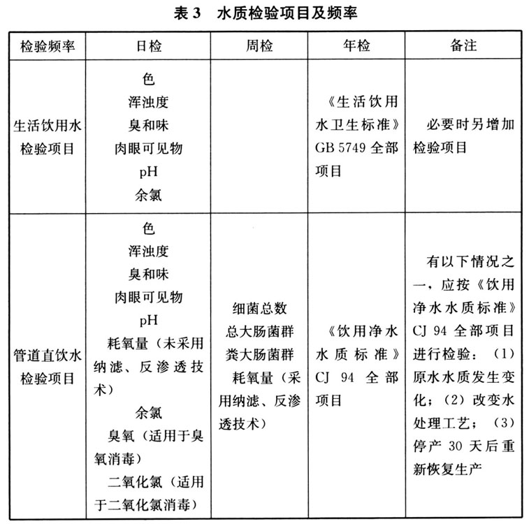 9. 2. 1 生活饮用水(含管道直饮水)、集中生活热水水质安全问题直接关系到民生健康,为保证供水质量和安全,运行管理者应进行日常水质检验。检验项目和频率从能保证供水水质和供水安全出发,并考虑所需费用。检测水质指标不符合国家现行标准《生活饮用水卫生标准》GB 5749和《饮用净水水质标准》CJ 94中规定的限值时,应及时查明原因,并采取相应措施。水质检验项目及周期按本表3进行。