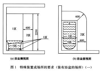 1区:由已固定的淋浴头或出水口的最高点对应的水平面或地面上方2250mm 的水平面中较高者与地面所限定区域;围绕浴盆或淋浴盆的周围垂直面所限定区域;对于没有浴盆的淋浴间,是从距离固定在墙壁或顶棚上的出水口中心点的1200mm 垂直面所限定区域。