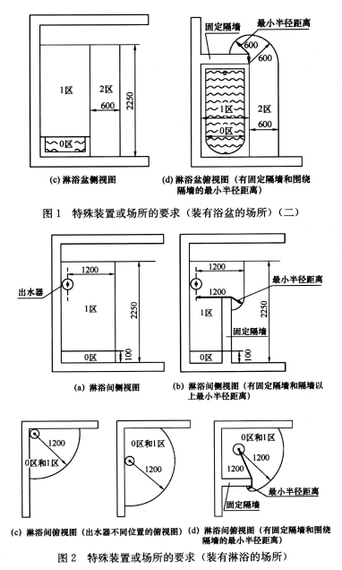 0区、1区、2区的划分参考了《低压电气装置 第7-701部分:特殊装置或场所的要求装有浴盆和淋浴的场所》GB/T 16895. 13和IEC 相关标准的规定(图1 、图2) 。