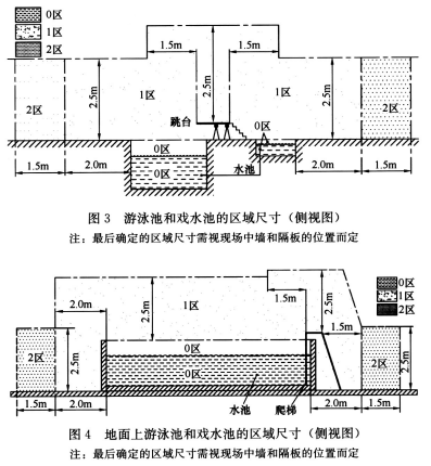 1区: 0区边界、水池边缘、积水处边缘到距离其2m的垂直平面;预期有人的地面或表面到高出地面或表面2.5m 的水平面。