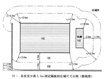 2 区: 1区外垂直面和与此垂直面相距1.5m 的平行平面之间;预期有人的地面或表面到高出其2.5m的水平面。