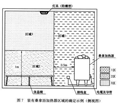区域1 、区域2 、区域3 的划分参考了《建筑物电气装置 第7-703 部分:特殊装置或场所的要求装有桑拿浴加热器的房间和小间》GB 16895. 14-2010 的规定和IEC 相关标准(图7) 。