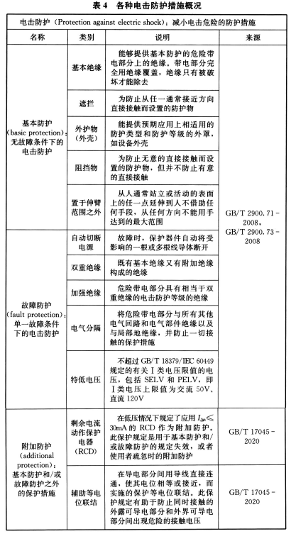 电击防护包括基本防护、故障防护和附加防护。我国系统地引入IEC 关于电击防护的标准,各种电击防护措施概况见表4 。