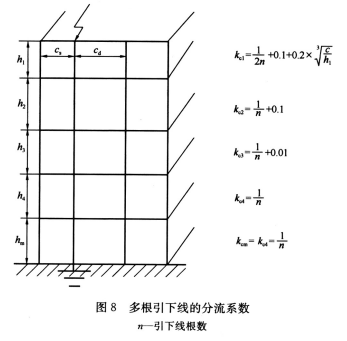 4 本款规定了利用结构圈梁中的钢筋连成闭合环路(均压环)的要求,多根引下线与均压环连接有助于实现雷电流的分流。根据《建筑物防雷设计规范》GB 50057-2010 附录E, 当没有均压环作用时,多根引下线的分流系数kc最小值为0.44。而当有均压环作用时,多根引下线的分流系数kc是按图8 所示确定的, kc的最小值可为1/n 。