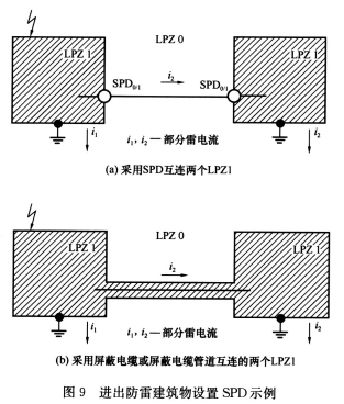如何判断进出防雷建筑物的低压电气系统和智能化系统应装设电涌保护器(SPD) ,可见图9 。图9(a) 的情况要加SPD,图9 (b) 的情况不用加SPD 。