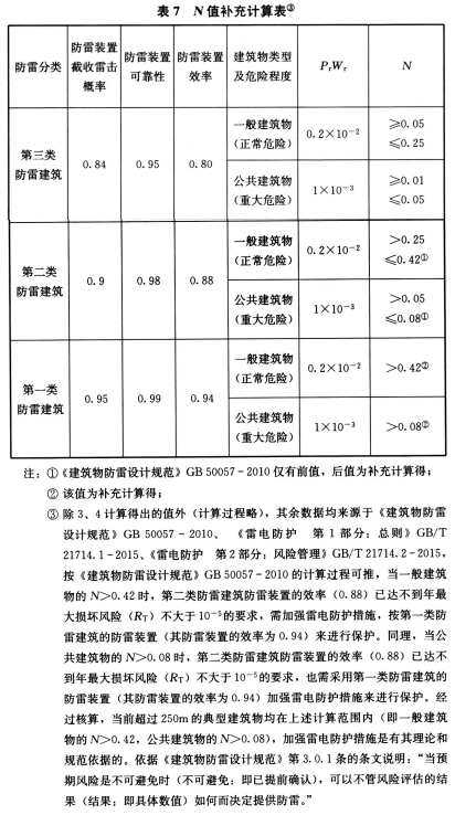 根据《建筑物防雷设计规范》GB 50057-2010 制定二类防雷保护类别的简化计算方法,并依据《雷电防护 第2 部分:风险管理》GB/T 21714. 2-2015 的基础数据,得出如下计算结果,见表7 。