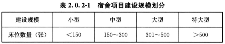2. 0. 2 宿舍、旅馆项目的建设规模应根据配套需求或市场需求,以及投资条件等确定。宿舍项目建设规模划分应符合表2. 0. 2-1的规定,旅馆项目建设规模划分应符合表2. 0. 2-2的规定。