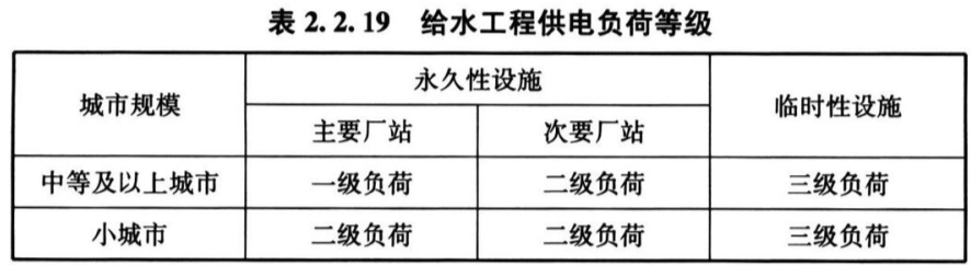 2. 2. 19 城市给水工程中,取水工程、净(配)水工程、转输厂站的供电负荷等级不应低于表2. 2. 19的规定;当不能满足表2. 2. 19要求时,应设置备用动力设施。