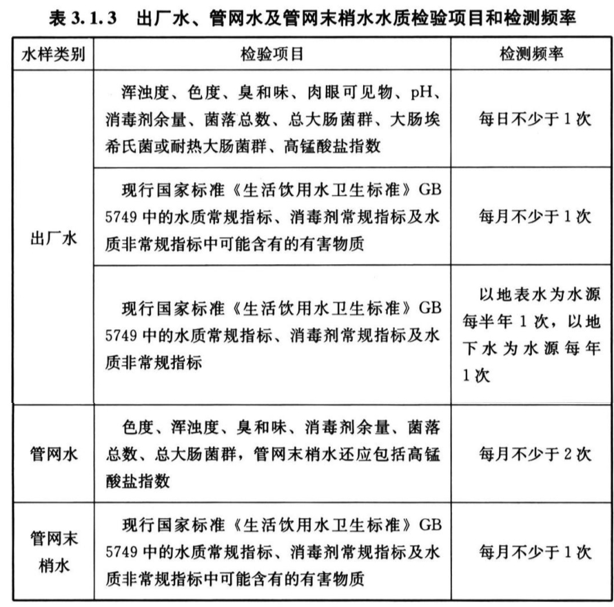 2 出厂水、管网水及管网末梢水水质检验项目和检测频率应符合表3. 1. 3的规定。