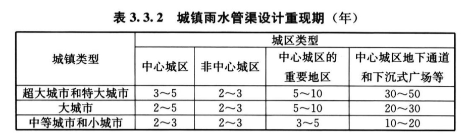 3. 3. 2 城镇雨水管渠的规模应根据雨水管渠设计重现期确定。雨水管渠设计重现期应根据城镇类型、城区类型、地形特点和气候特征等因素,经技术经济比较后,按表3. 3. 2的规定取值,并应明确相应的设计降雨强度。
