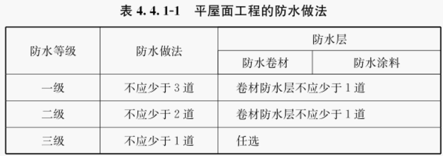 1 平屋面工程的防水做法应符合表4. 4. 1-1的规定。