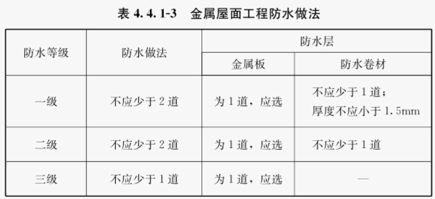3 金属屋面工程的防水做法应符合表4. 4. 1-3的规定。全焊接金属板屋面应视为一级防水等级的防水做法。