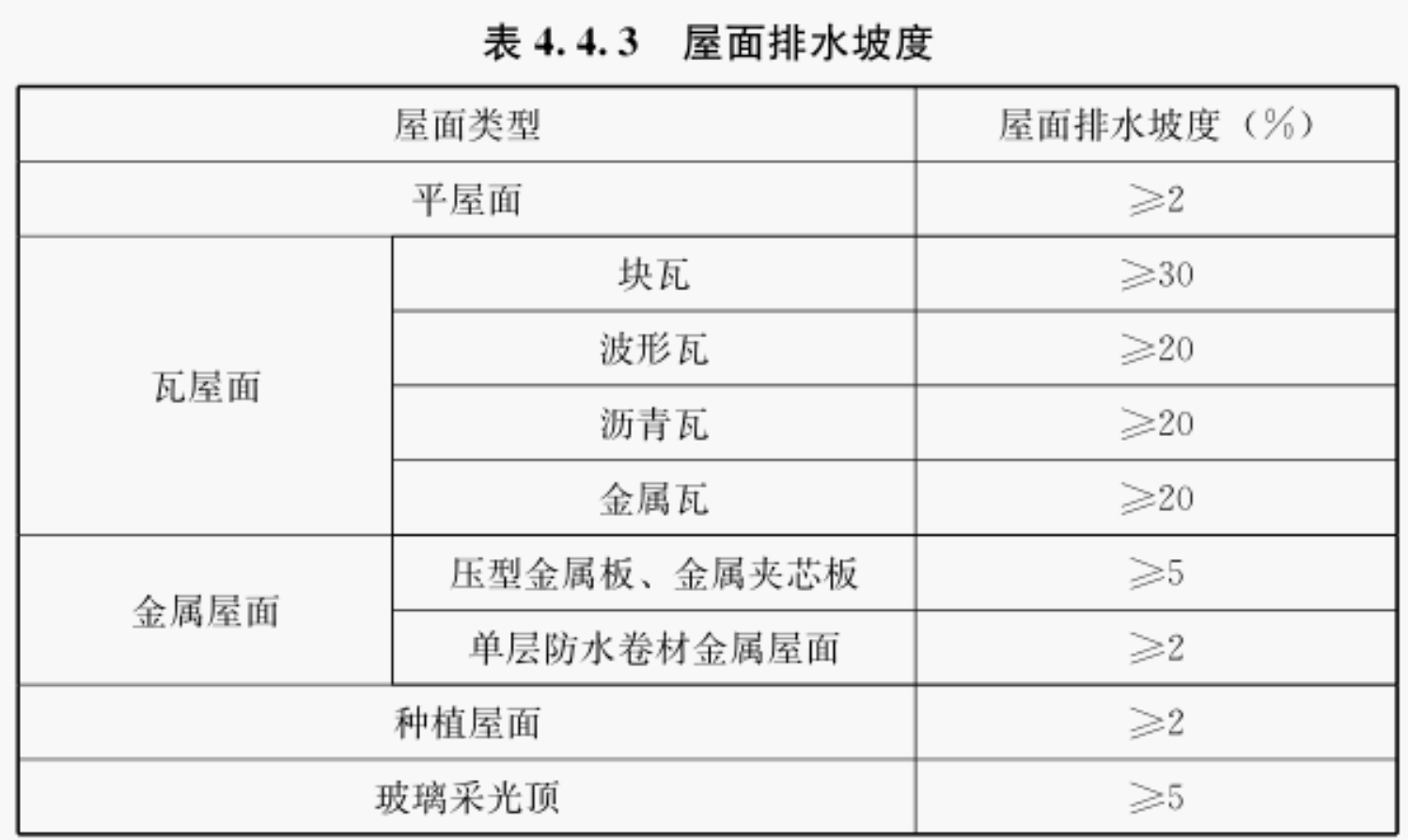 4. 4. 3 屋面排水坡度应根据屋顶结构形式、屋面基层类别、防水构造形式、材料性能及使用环境等条件确定,并应符合下列规定: