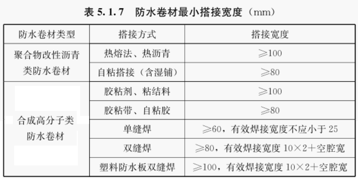 5. 1. 7 防水卷材最小搭接宽度应符合表5. 1. 7的规定。