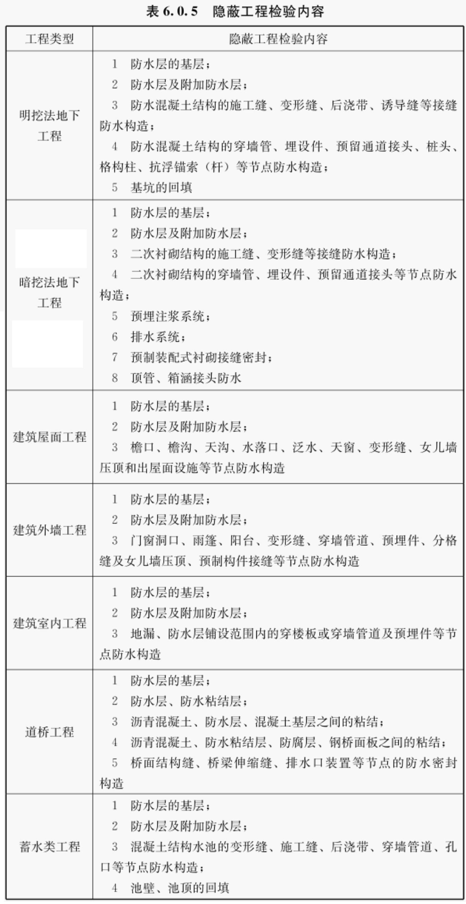 6. 0. 5 防水隐蔽工程应留存现场影像资料,形成隐蔽工程验收记录,防水隐蔽工程检验内容应符合表6. 0. 5的规定。