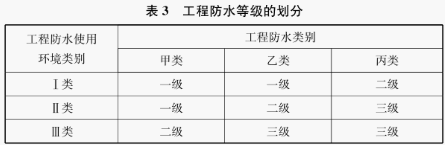2. 0. 6 工程防水等级是采取防水措施的重要指标,由工程防水类别和工程防水使用环境类别共同确定。本规范将防水等级分为三级,一级防水所对应的防水等级最高,二级防水次之,三级防水最低。防水等级是一种等级分类法,是为了便于制定目标、指导并评判防水工程的实施所采用的指标。防水等级具有层级属性,其实质是防水功能的有效性。无论是防水系统预期要实现的目标,还是所采取的防水措施,防水有效性都可以采用可靠度或者防水失效概率进行判定。防水等级对应的设防措施主要包括设防道数、防水层厚度等。工程防水等级的划分见表3。