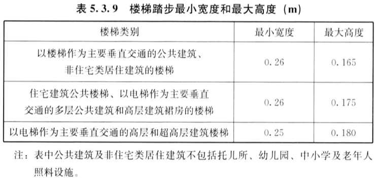 5. 3. 9 公共楼梯踏步的最小宽度和最大高度应符合表5. 3. 9的规定。螺旋楼梯和扇形踏步离内侧扶手中心0.25m处的踏步宽度不应小于0.22m。