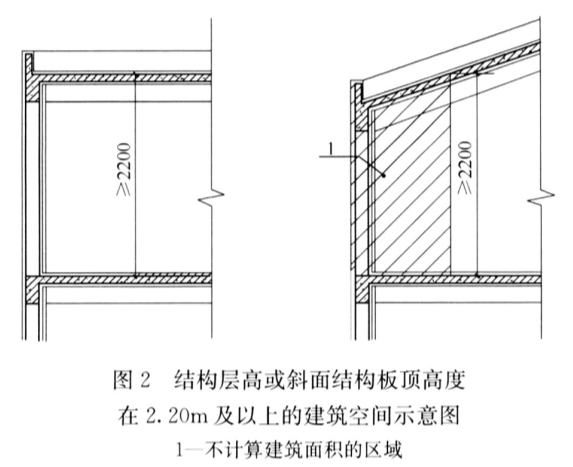 1 结构层高或斜面结构板顶高度小于2.20m的建筑空间:层高小于2.20m的设备管道夹层、结构板顶高度小于2.20m的坡屋顶等。