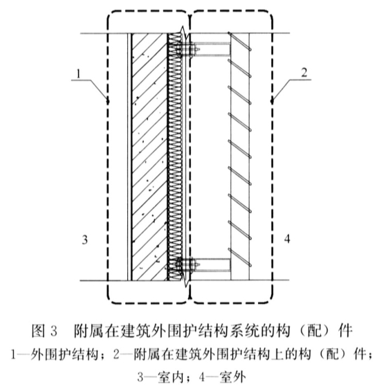 3 附属在建筑外围护结构的构(配)件,指附属在外围护结构的装饰、遮阳、设备平台等构(配)件,如:附属在外墙的装饰柱、门窗线脚、勒脚、突出墙面的装饰线条、空调机板、遮阳板、建筑挑檐、无柱雨篷等非建筑外围护结构系统的构(配)件(见图3)。